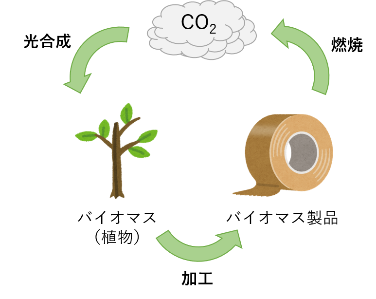 2つ目は、「温室効果ガス排出量の削減効果」です。石油や、石油から作られた製品を燃やすと、地球温暖化の原因となる二酸化炭素CO2が発生します。これは、石油の中に炭素Cが含まれているためです。バイオマスにも石油と同じように炭素Cが含まれており、燃やすとCO2が発生しますが、バイオマスに含まれる炭素Cはもともと原料の植物が光合成で大気中から吸収したCO2に由来します。また、発生したCO2は、新たに栽培される植物の光合成によって再び吸収されます。そのため、植物由来のバイオマスが燃焼しても、大気中に新たに排出されるCO2の量は実質0である、と考えることが出来ます。
