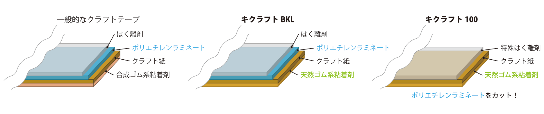 さらに、キクラフト100は、基材のポリエチレン(=プラスチック)ラミネートを無くす事によって、石油由来の材料の使用量を削減しています。一般的なクラフトテープは、クラフト紙の上にポリエチレンがラミネートされており、さらにその上に*はく離剤*はく離剤…クラフトテープをスムーズに繰り出すために塗布されているコーティング剤が塗布されていますが、キクラフト100は独自に設計した特殊なはく離剤を使用する事によって、クラフト紙に直接はく離剤を塗布しています。