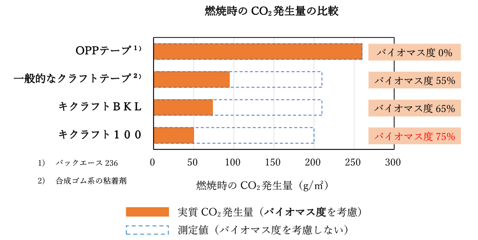 それでは、バイオマス度の高いクラフトテープを使用することで、どれくらい環境への負荷を抑えることが出来るのでしょうか。実際の測定結果を下記に示します。
