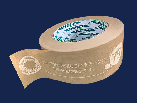 「天然ゴム系粘着剤を使用している」「ポリエチレンラミネートの無いクラフト紙を使用している(キクラフト100)」といった特長から、キクラフトBKLやキクラフト100は、一般的なクラフトテープと比べてバイオマス度の高い製品となっております。具体的には、一般的なクラフトテープのバイオマス度が50~55%程度であるのに対して、キクラフトBKLのバイオマス度は65%、キクラフト100のバイオマス度は75%となっております。